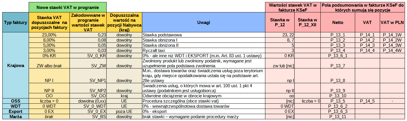 Użytkownicy muszą mieć świadomość, że wybierając określony typ dokumentu oraz stawkę VAT dla pozycji towarowych ich wybór będzie miał wpływ na to, gdzie poszczególne dane trafią do faktury ustrukturyzowanej KSeF. Poniżej w tabeli wszystkie przypadki typu faktury i stawki VAT, wraz z informacją o tym jak program wypełnia fakturę ustrukturyzowaną wartościami netto i kwotami VAT.
